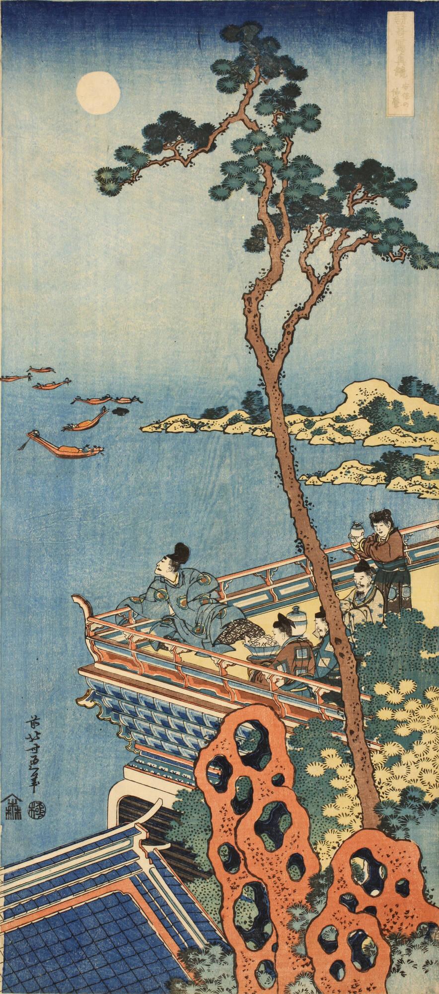 Not on viewA man in formal Japanese attire sits on a balcony, gazing at the moon in the distance. With him are three other formally dressed gentlemen, but their servant, who brings a gift, is dressed in Chinese-style clothing. A closer look at the architecture, and particularly the large Chinese garden rock in the foreground, would have indicated to viewers in Edo that the group was in China. This is an image of Abe no Nakamaro 阿倍仲麻呂 (ca. 698–770), a scholar and poet of the Nara period who studied in China. The scene illustrates one of his poems: