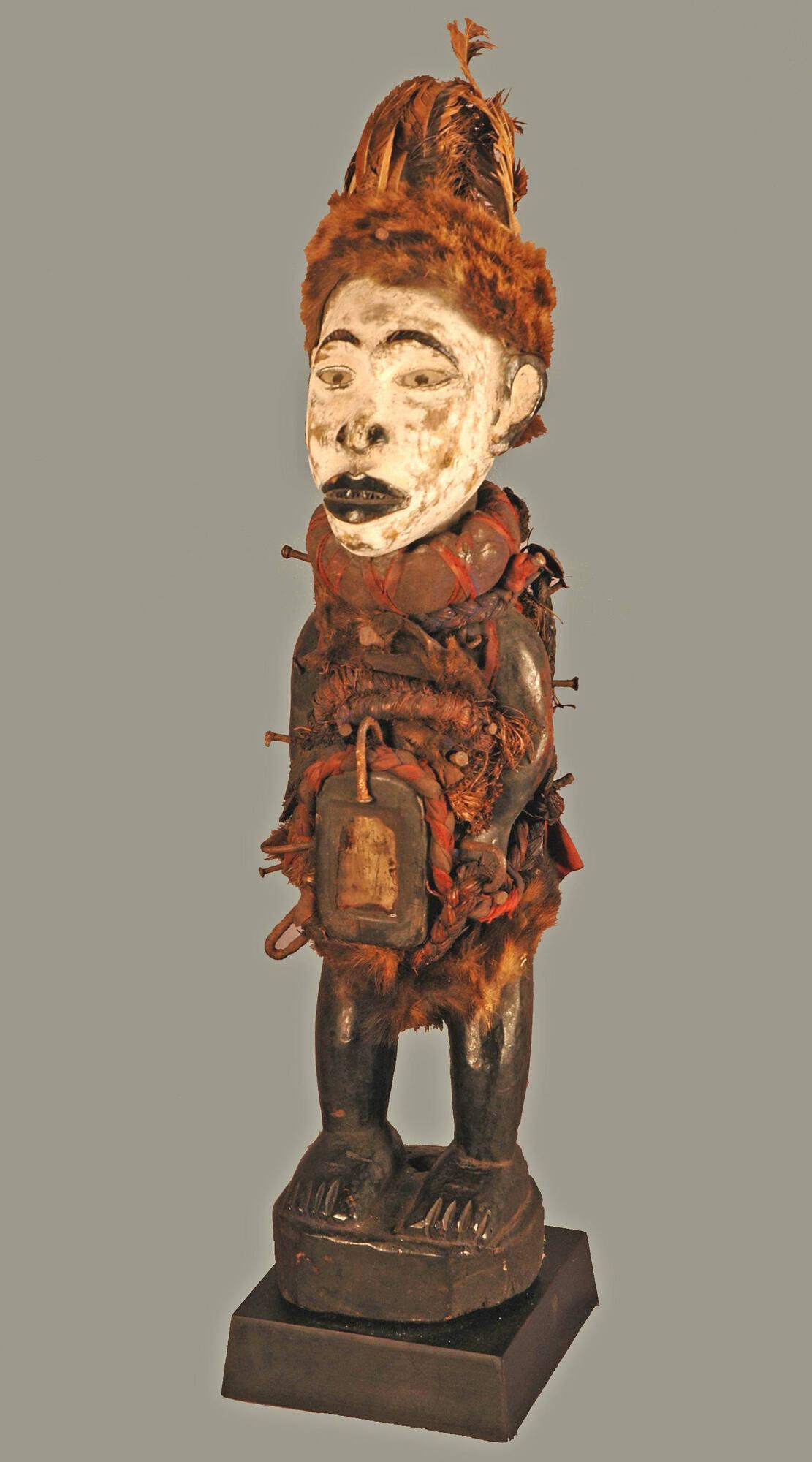 This nkisi figure is masterfully carved as a naturalistic standing male; his face strong and aggressive, and his hair a complex of feathers and other organic objects in a complex coif. The body is covered by a large quantity of various magical materials. The figure is ‘empowered’ by the addition of the nkisi charm in its belly and possibly in other cavities as well. The addition of white pigment to the face connects the nkisi with the spirit world.