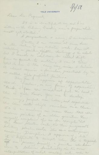 MediumOne-page letter in pencil on white writing pad with Yale letterhead; return address on additional torn piece of paper