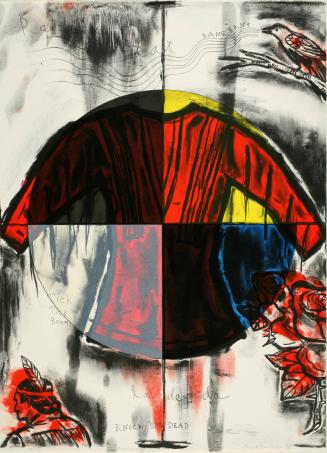 Not on viewMuch of Jaune Quick-To-See-Smith’s art focuses on her Native American identity and the politics of race in the United States. This work, created during the Iraq war, critiques Winston Churchill’s term “theatres of war,” an association of the arts with the violence of combat that Smith deemed inappropriate. At the bottom left is the Lone Ranger’s sidekick Tonto, a fictional character that Smith often employs in her work to indicate her disapproval of a subject. While the four-part circle at the center of the composition can be interpreted as a Native American symbol for the four seasons or the cardinal directions, it also suggests the crosshairs of a rifle. The red garment is a Native American war shirt, a ceremonial piece of clothing that for the artist represents religious philosophy, democratic ideals, and social wisdom. The surrounding phrases were drawn from Broadway songs, but also evoke the sounds of war.
