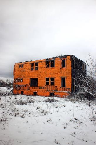 Not on view“Awareness brings action.” This is the rallying cry of a group of Detroit-based artists who call attention to urban decay by painting every abandoned building in the city in “Tiggeriffic Orange,” a color trademarked by the Disney Corporation. (The artists call their project of painting derelict houses Detroit. Demolition. Disneyland.) This bright color makes the buildings insistently visible, and the paint is easily available for purchase, fitting Object Orange’s invitation to Detroit residents to “Take action. Pick up a roller. Pick up a brush. Apply Orange.” Appealing to the public for assistance, Object Orange hopes that the city government will be persuaded to demolish or rebuild these decaying buildings. Although the ultimate objective is to help heal the city’s deep scars, Detroit officials have regarded the artists’ intervention as criminal activity.