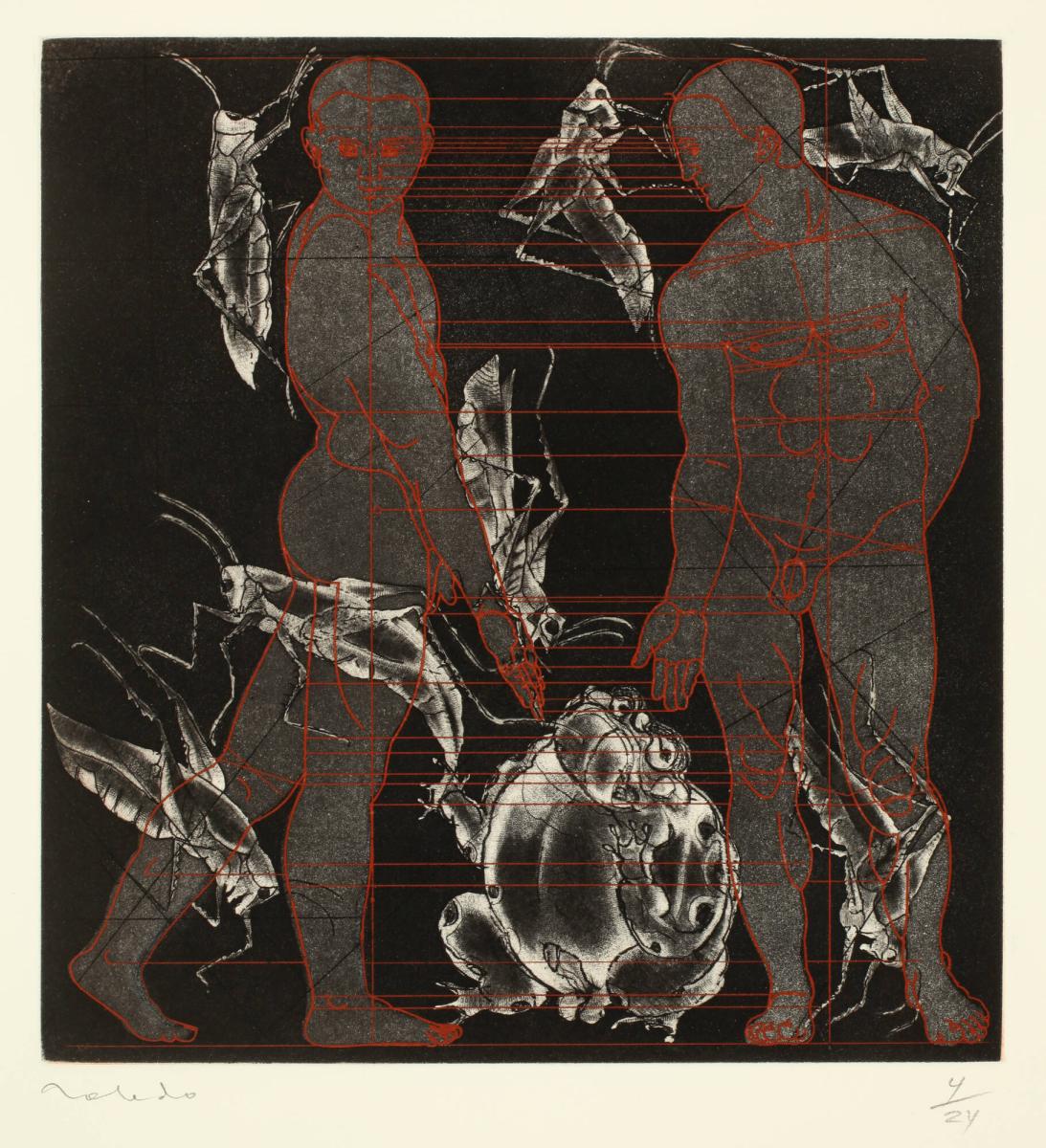 Not on viewIn this print, Toledo riffs on a woodcut by German Renaissance artist Albrecht Dürer, likely from Dürer’s Four Books on Human Proportion (published posthumously in 1532–1534). Dürer based his studies on those of Leonardo da Vinci and others. He notably included examples of figures of all ages and sizes, a fact perhaps mocked by Toledo’s inclusion of a rotund toad with an erection. Grasshoppers are historically and symbolically important in Mexico, not least of all as a popular snack. Their inclusion here, and their large scale, may suggest a further critique of Dürer’s pseudo-scientific ideas about anatomy.