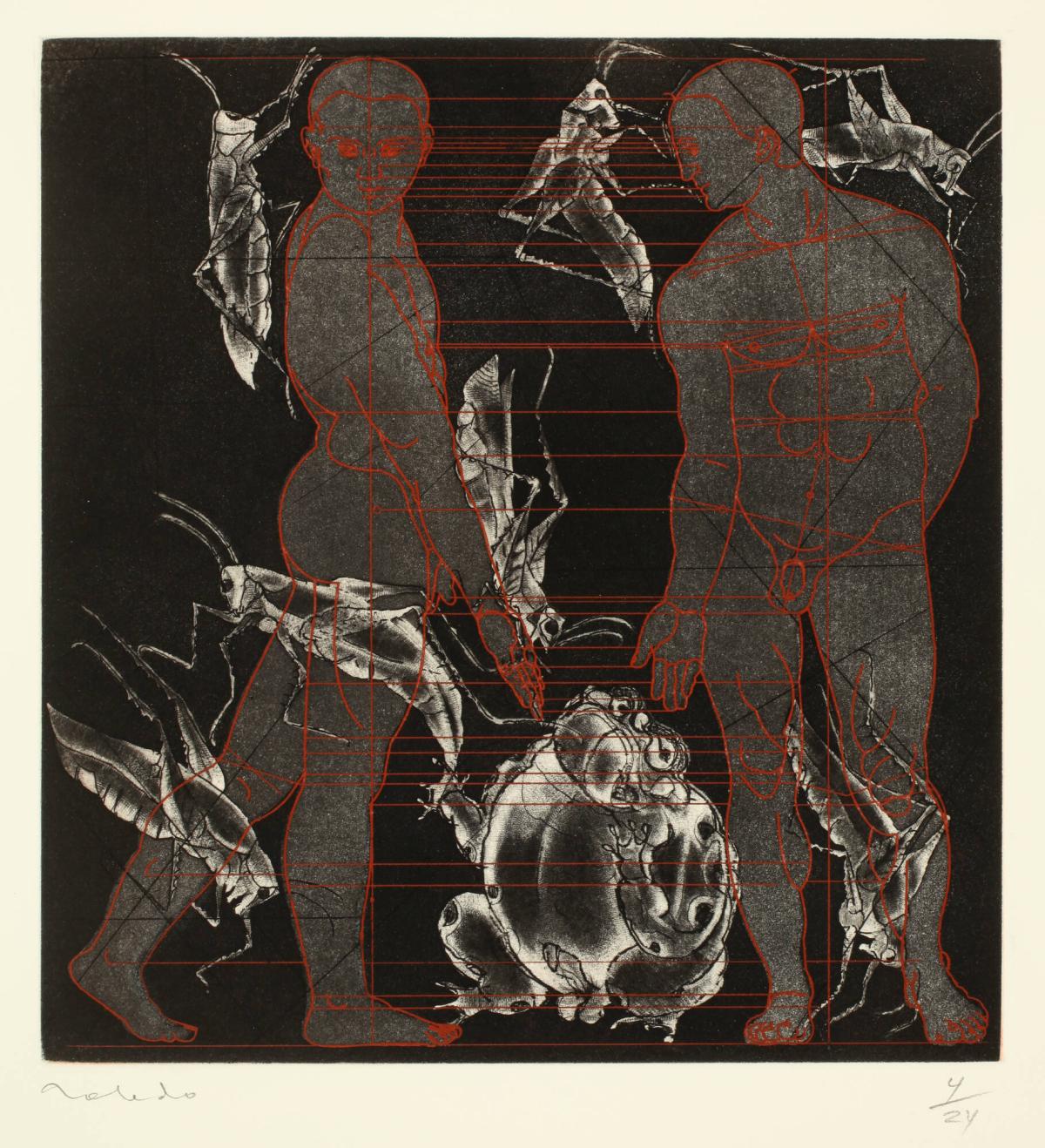 On viewIn this print, Toledo riffs on a woodcut by German Renaissance artist Albrecht Dürer, likely from Dürer’s Four Books on Human Proportion (published posthumously in 1532–1534). Dürer based his studies on those of Leonardo da Vinci and others. He notably included examples of figures of all ages and sizes, a fact perhaps mocked by Toledo’s inclusion of a rotund toad with an erection. Grasshoppers are historically and symbolically important in Mexico, not least of all as a popular snack. Their inclusion here, and their large scale, may suggest a further critique of Dürer’s pseudo-scientific ideas about anatomy.