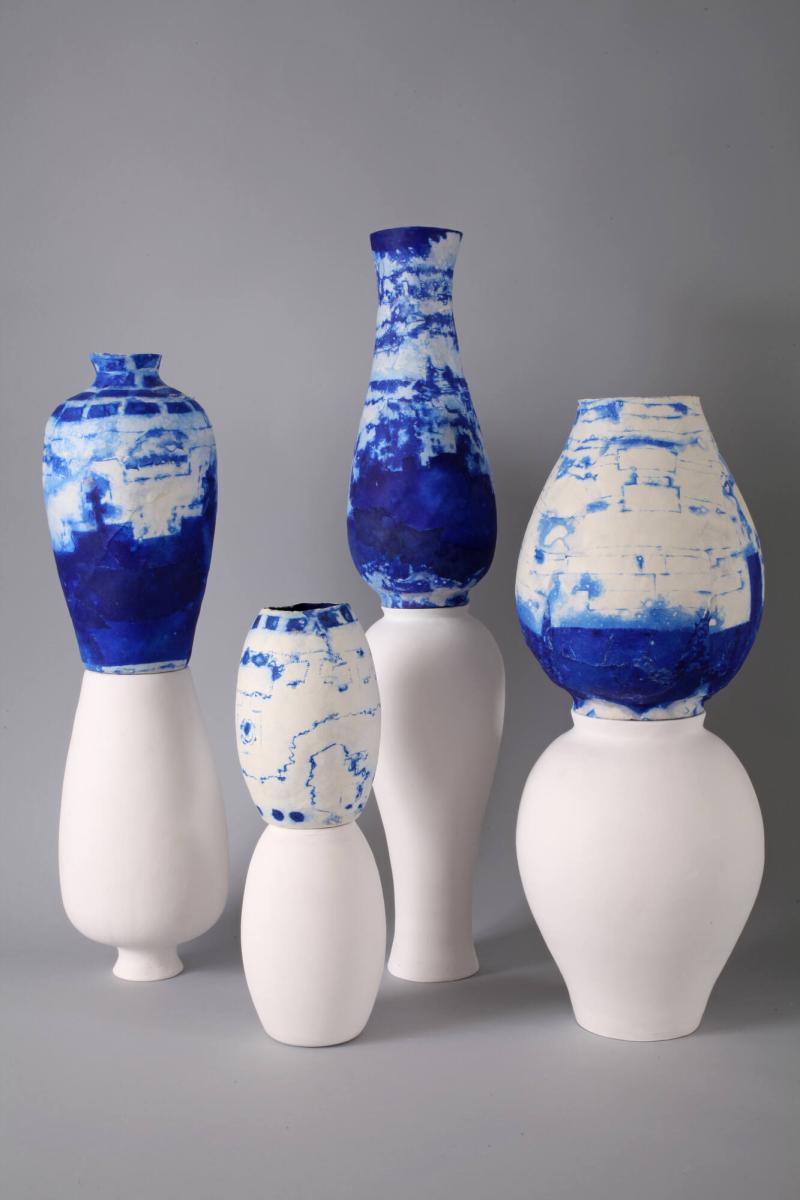 On viewArlene Shechet has long found inspiration from Asia, and in her early work often referenced Buddhist forms and concepts. The more than 100 sculptures she created for the Once Removed series were originally installed in a complex, stepped-pyramid arrangement based on a Buddhist mandala, a conceptual architectural model used as a focal point for meditation. The blue and white of the paired sculptures also plays with the idea of an architect-tural blueprint, and the forms of the sculptures reference classic Chinese “blue and white” (qīnghuā 青花) porcelain shapes.