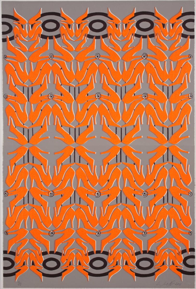 Perhaps the ultimate fetish object, the red high heel takes center stage in Willie Cole’s Rapture. Surrealist artist Salvador Dalí had explored the fetishistic power of the red pump in his infamous assemblage Scatological Object Functioning Symbolically (The Surrealist Shoe). Dalí's intention was that a sugar cube be dissolved in a glass of warm milk placed inside his wife’s shoe, which he envisioned as an enactment of the Freudian desire to return to the womb of the mother, represented by the milk. In < I>Rapture, by contrast, Cole completely de-fetishizes the red pump by converting its repeated silhouette into an abstract, all-over pattern reminiscent of African textile traditions. Cole frequently creates such Africanized forms by transforming household objects into symbols of power and memory.
