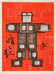 For the 1989 bicentennial of the French Revolution, the Museum of Modern Art in Paris commissioned Paik to create a series inspired by revolutionary leaders, their lives encapsulated within the artist’s signature robots. This print references Jean-Paul Marat (1743–1793), each screen a set of Paik’s multilingual thoughts and associations with the radical thinker’s writings, life, and death. Prominent at the left are the Chinese characters for “assassination” (ànshā 暗殺), and on the right and center are sketches based on Jacques-Louis David’s iconic painting of Marat dead in his bathtub, La Mort de Marat (The Death of Marat).
