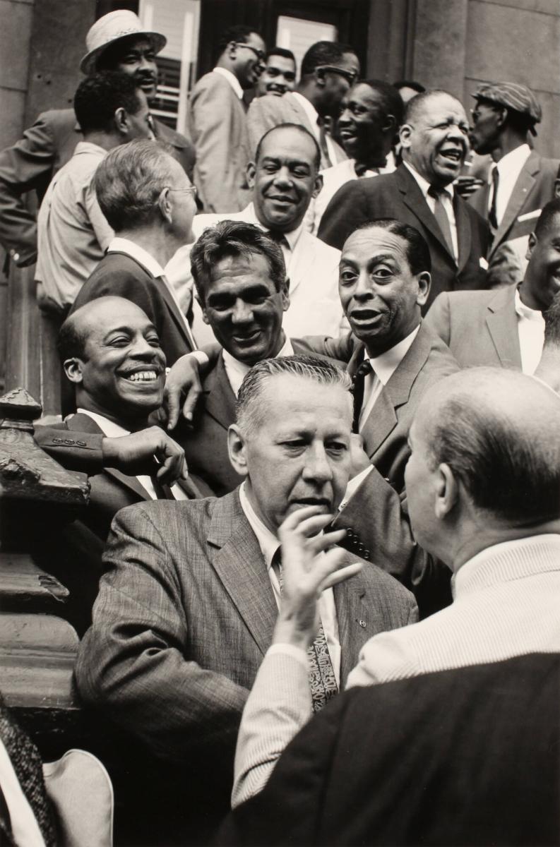 First Row: George Wettling and Bud Freeman; Second Row: Jo Jones, Gene Krupa, and Sonny Greer; Third Row: Miff Mole, Zutty Singleton, Red Allen, Taft Jordan; Top Row: Dickie Wells, Buck Clayton, Benny Golson, Art Farmer, Hilton Jefferson, Art Blakey. Esquire Magazine Shoot, Harlem, New York City
