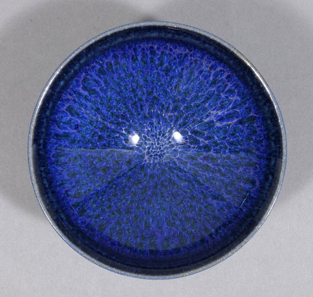 Kamada Kōji has updated the Tenmoku tradition with a blend of the style’s characteristic glazes and the addition of dramatic new colors, such as this deep blue. The rippling patterns left by the flowing glaze are kiln effects (yōhen 燿変).