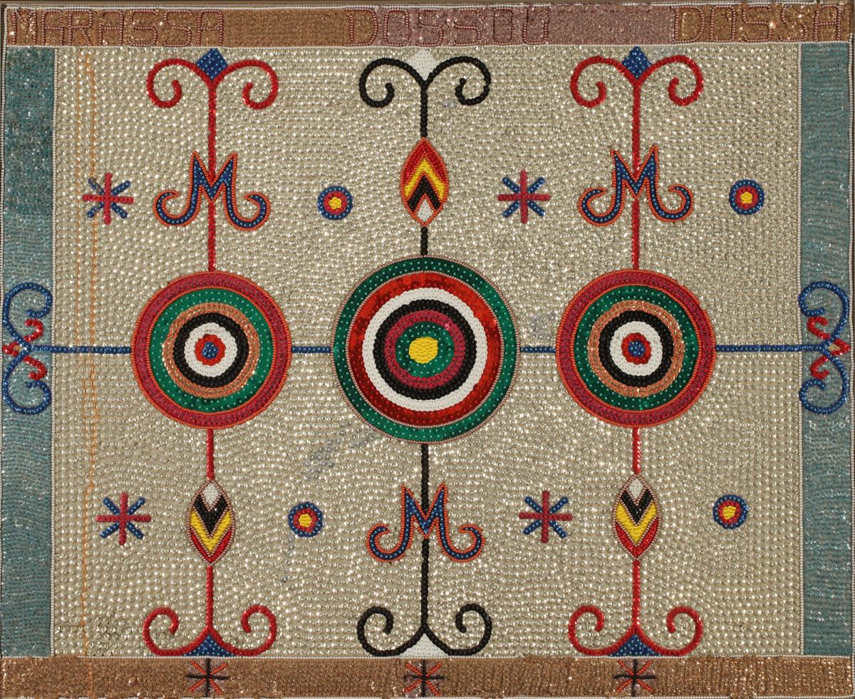 Not on viewIn the French colony of Saint-Domingue, now Haiti, enslaved Africans fabricated a series of ritual systems today called Vodou. Though its name derives from vodun, a word referring to spiritual forces in Benin and Togo, Vodou pulls from a range of western and central African religions: Catholicism, native Taíno beliefs, Freemasonry, and European mysticism. The religion’s sumptuous, lively ceremonies often begin with dances performed by members who serve the Iwa (spirits), who carry elaborate flags sacred to specific Iwa. The flashy sequins covering the surface of this work come from a period when dressmaking factories were common in Haiti, and employees collected fallen sequins to use in decorating dwapo. By the late 20th century, artists began to produce elaborate sequined dwapo for sale to collectors and for the export market. This dwapo was likely produced by an artist active in the Bel-Air neighborhood of Port-au-Prince in the 1980s or 90s. Its title and vèvè (ritual design) honor Marassa, the personification of twins. The three circles in the design, however, pay homage not just to twin children but also to the child born after them: a strong-willed third aspect of Marassa, which is called dossou or dossa, depending on the child’s gender.