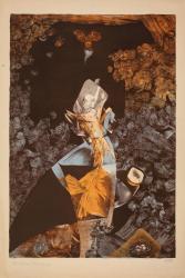 Although Dorothea Tanning was frequently overshadowed by her husband and fellow artist Max Ernst, she forged her own impressive artistic career throughout the 20th century. Upon visiting an exhibition at the Museum of Modern Art in New York, Tanning discovered her fascination with Surrealist art. Her Surrealist aesthetic is exemplified in this dream-like image of a semi-abstracted female figure who holds up a large pocket watch in her left hand. She stands upon a boat that transports her through a sea of crashing waves inside of a dark grotto. Tanning portrayed a world that seems peaceful yet haunting. At the lower right, a bird nest cradling five eggs rests atop a wooden board that moves calmly along the rolling waves; on the boat’s bow, an eye with two irises eerily confronts the viewer. In an interview, Tanning remarked that she hoped to produce “an event or an enigma… the boat, the waves and the timepiece can take you anywhere you want to go…”