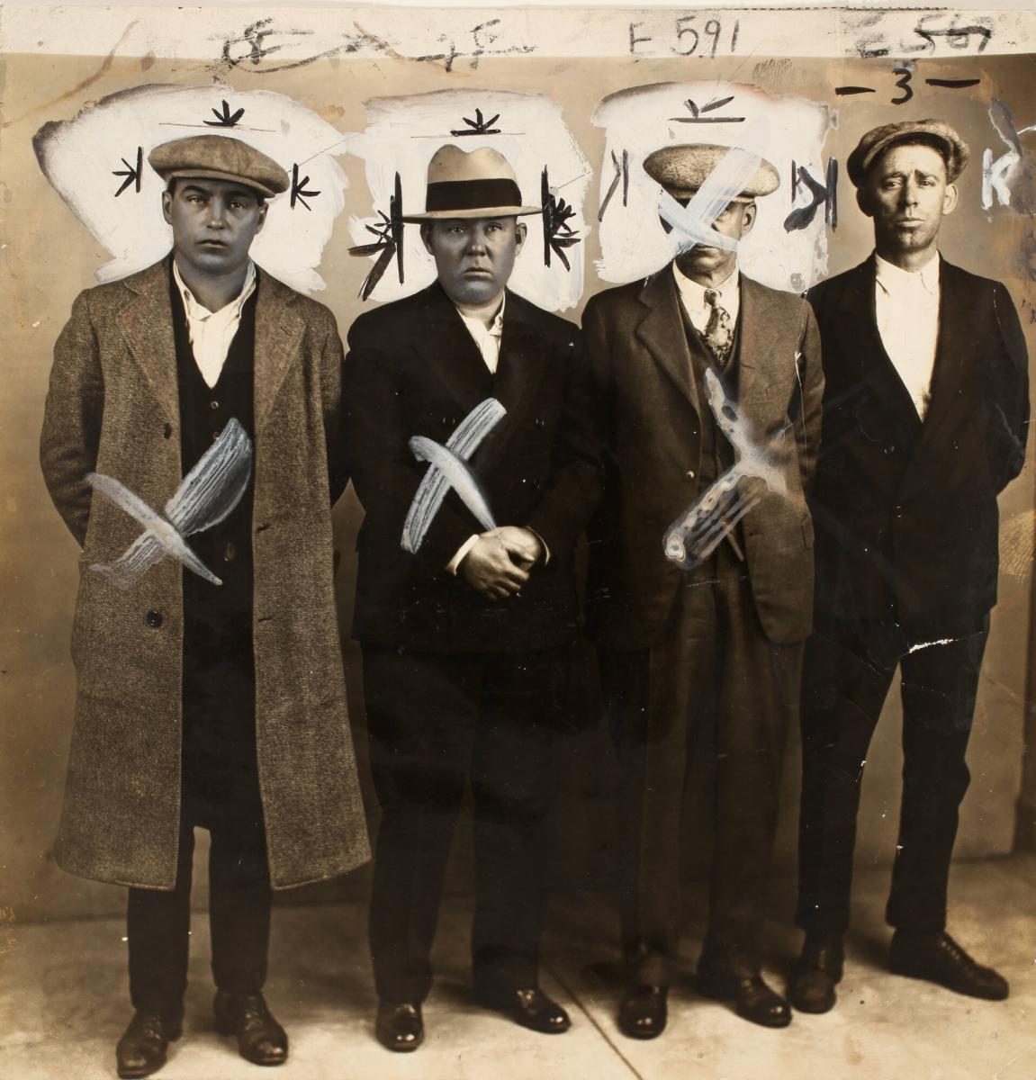 Not on viewThe faces of these individuals would have been repeated thousands of times in the printing of a newspaper. The men pictured are suspects in the killing of Edward McGuire in a gang feud in the early 20th century. This photograph serves as a physical record of a single image on the cusp of its own reproduction. The photograph as object reveals the many ways in which media is constructed for the purposes of its publishers and consumption by its audiences, the editor’s visible marks making clear the manipulation of images as they enter our daily lives. This composition clarifies not only the process by which images act as public informants, but also asks its viewer to consider how the dissemination of pictures comes to influence broader perceptions and expectations of what criminality looks like.