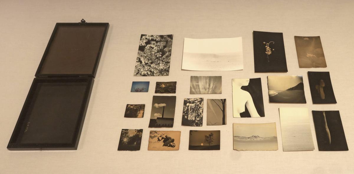 The photographs here, despite their varying sizes and subjects, all strikingly utilize empty, or “negative,” space. Yamamoto delicately distressed, toned, and colored the photographs, giving them an aged appearance that contrasts with the ephemeral atmosphere of the images. His photographs are often likened to Japanese haiku—short poems that use simple, direct imagery inspired by nature.