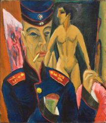 This work, with its raw and garish colors, was included in the 1937 Entartete Kunst-Degenerate Art-exhibition put on by the Nazi authorities in Munich, after which it traveled to other cities in Germany in 1937-38. In Munich, the painting was exhibited in room 3, with other Kirchners, as "Soldier with Whore," under the texts "Deliberate sabotage of national defense" and "An insult to the German heroes of the Great War," while next to the painting were the (sincere) words of a German curator likening Kirchner's art to that of Dürer: "We are in the presence of the first German artist to achieve a penetrating quality that can be likened to that of Dürer, E. L. Kirchner." The use of the quote in this context was meant to mock both the curator, and the artist. Kirchner, like Dürer, was known for the power of his woodcuts, and the short strokes and angular forms in this work make reference to that medium.