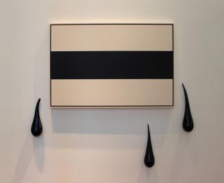 Not on viewLIBERATION takes as its subject the Black Liberation flag designed by Marcus Garvey in the 1920s as part of the Pan-African movement, which argued that all African peoples—those on the continent and those in the diaspora—are united in a common struggle. Wilson has removed the flag’s red color, which represents the blood shared by people of African ancestry and the blood shed in pursuit of liberation, as well as its green, which nods to the abundant natural wealth of Africa. What remains is a central black stripe on raw canvas, from which blown-glass drips that evoke blood, tears, oil, and ink appear to seep.