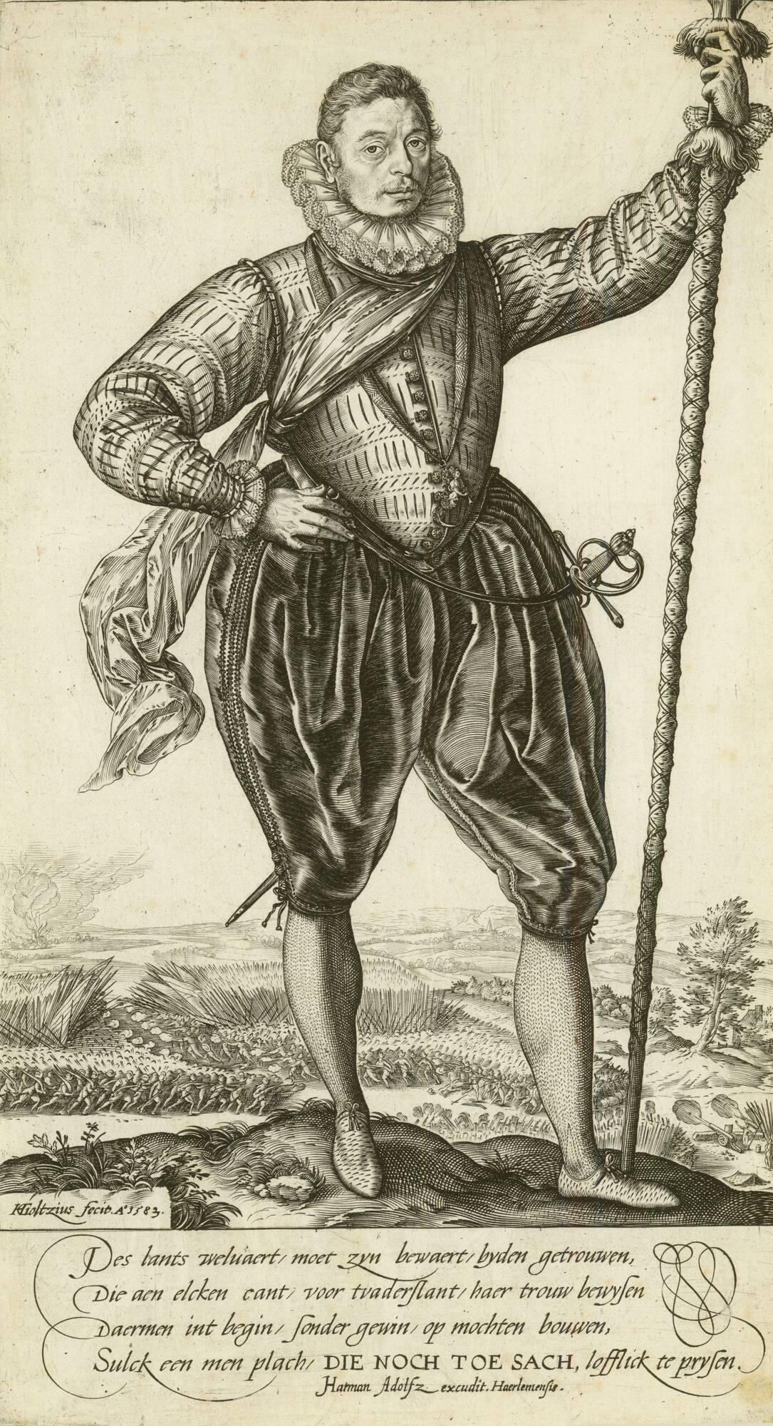 Not on viewGoltizius's imposing figure demonstrates the effective us of a swaggering pose and military garb to convey dignity and stature. The sitter's lance and uniform, as well as the massed formations of troops in the background, indicate that he is an officer in the military – possibly Pieter Dircksz Hasselaer, a commander of Dutch troops during the siege of Haarlem (1572–73).