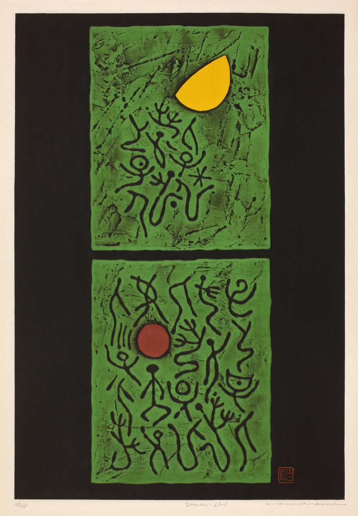 In Dance 69–1, Maki Haku takes seal script characters for “man,” “woman,” and “child,” along with modified and created characters, and brings them to life in a scene of pulsating movement and energy. The red circle at the bottom suggests a fire around which the people are gathered. Above the figures is the yellow form of a waxing gibbous moon, toward which they seem to reach.