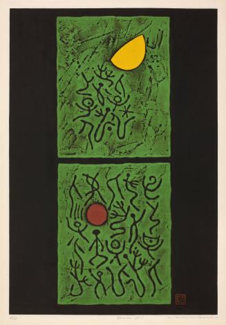 Not on viewA self-taught printmaker, Maki Haku was a prolific member of the Creative Prints (sōsaku hanga 創作版画) movement begun in the 20th century. He first gained recognition for calligraphic prints, often using seal script for its aesthetic qualities. His seal characters might be recognizable words, or, as seen in these two prints, could be altered and stylized, suggesting inchoate meanings or empasizing the pictorial character of seal script.