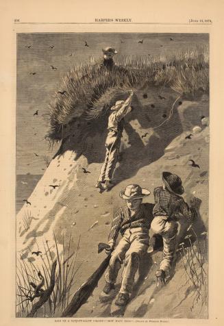Not on viewIn this page from Harper’s Weekly, four children are shown scaling a sandy bank. A colony of riled sand-swallows circles around them. The picture’s caption— “how many eggs?”—suggests that the children are involved in a game to collect as many sand-swallow eggs as possible. In the face of the Industrial Revolution, Homer’s image harkened back to a simpler way of life, represented by scenes of outdoor play and leisure. Here, Homer’s subjects assume a manifold relationship with the land on which they play. On the one hand, the children’s game can be perceived as natural and resourceful, provoking a kind of symbiosis with their surrounding environment. On the other, their “raid” is intrusive, even exploitative, as it encroaches upon the birds’ natural habitat.
