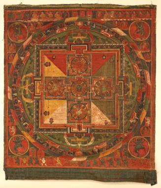 Not on viewIn Indo-Tibetan Tantric Buddhism, complex rituals and forms of meditation are utilized to alleviate the suffering of an unenlightened existence by leading practitioners to the realization that all perceived phenomena are inherently empty (śūnyatā). One such practice involves maṇḍala (Tibetan: dkyil-‘khor), a term that most often refers to a cosmogram, or geometric representation of a spiritual universe. Often the maṇḍala centers on a specific deity in the form of which tantric adepts visualize themselves, embodying the deity’s perspective on the reality to which the maṇḍala points. In this case, that deity is Hevajra Kapāladhara, or the Skullcup-holding Hevajra.