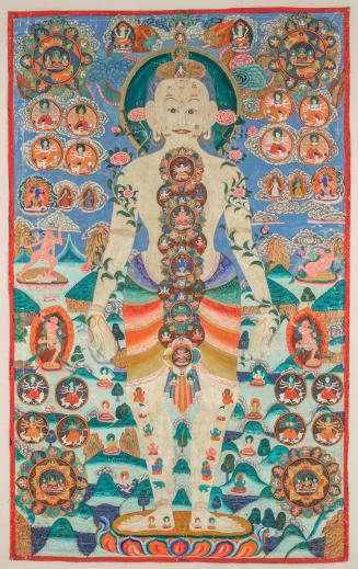 Not on viewA large human figure stands on a colorful lotus blossom, facing us against a background of mountains, sky, and clouds. Numerous small images of Tibetan Buddhist deities populate the landscape and float in the sky. Images of deities are also seen within the body of the figure. They appear in the face, in the legs and feet, and many are arranged in the petals and interior of symbolic lotus blossoms that line the figure’s central axis.