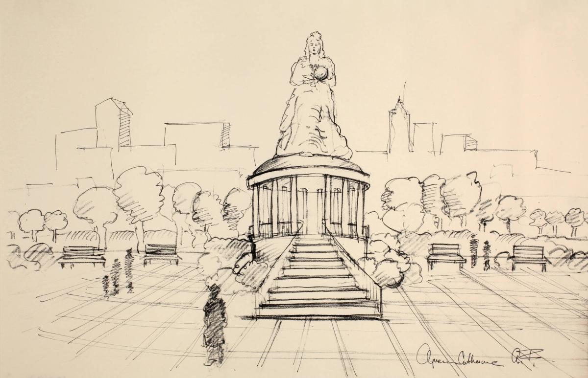 Sketch for Installation of the Colossal Queen Catherine Statue to be sited on the Queen Side of East River NYC: Central Stairway to the Rotunda