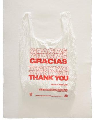 Not on viewAnalia Saban has earned a reputation for playing with materials in ways that seem impossible. She has unraveled paintings, turning the threads of their canvases into a giant ball; draped concrete and marble slabs over sawhorses as if they were sheets of fabric; and used photographic emulsion as a pigment for painting. Prompted by the California ban on single-use plastic bags that went into effect in 2016, Saban’s series Paper or Plastic? extends that fanciful experimentation into the realm of printmaking. Working with master printers, Saban created a three-dimensional mold from a crumpled plastic bag and used it to generate a series of relief prints, each with a design derived from bags Saban collected from corner stores and bodegas in Los Angeles.