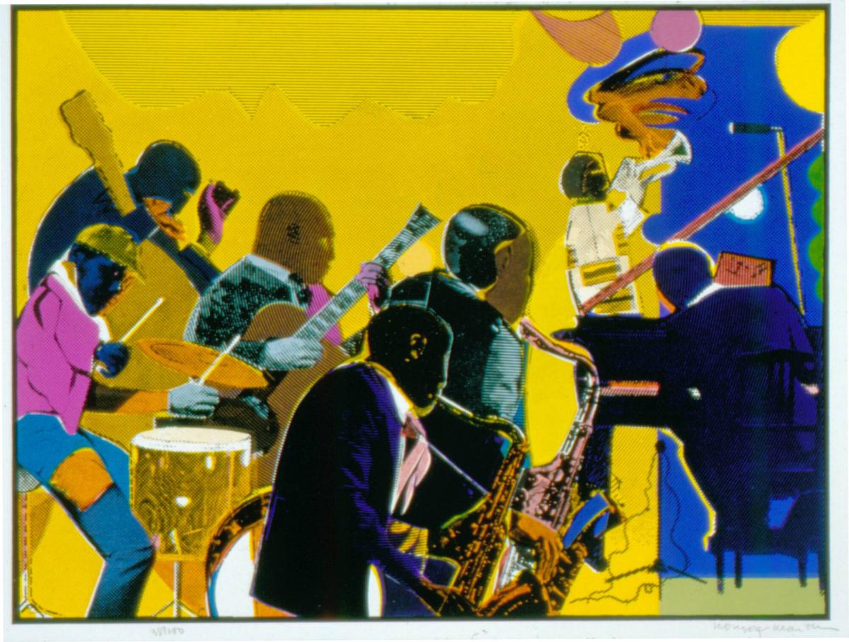 Not on viewJazz is a frequent subject of Romare Bearden’s prints and collages. In 1920, when Bearden was eleven, his family relocated to New York from North Carolina at the height of the Harlem Renaissance. He became immersed in the movement through his parents’ friendships with musicians, artists, and writers, including Duke Ellington and Langston Hughes. Bearden also looked to Dutch painters—Pieter Bruegel, Jan Steen, Pieter de Hooch, and others—because of their sensitive depictions of the middle and lower classes. As Bearden put it, “I am a man concerned with truth, not flattery, who shares a dual culture that is unwilling to deny the Harlem where I grew up or the Haarlem of the Dutch masters...” Outchorus marries these divergent influences, depicting one of the unifying tentpoles of culture in a medium intended for wide distribution. To make this print, Bearden created hand-colored underlays on Mylar, achieving washes of color by experimenting freely as one might in live jazz. A shaded, or “continuous tone” photographic print was then superimposed on top, adding a matrix of dots.
