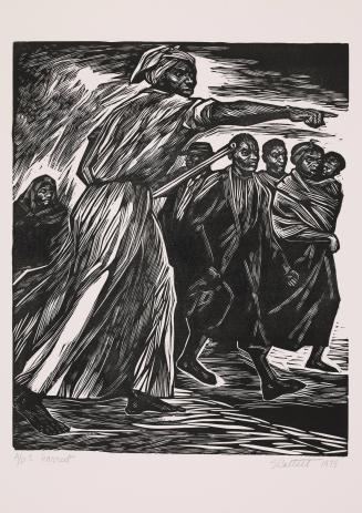 In this print, her courage, strength, and leadership as she conducts a group of people to freedom on the Underground Railroad are communicated by the forceful forward motion of her arm and stance, and her determined gaze. Elizabeth Catlett’s use of a low viewpoint and dramatic sky also impart to Tubman a monumental, heroic stature.