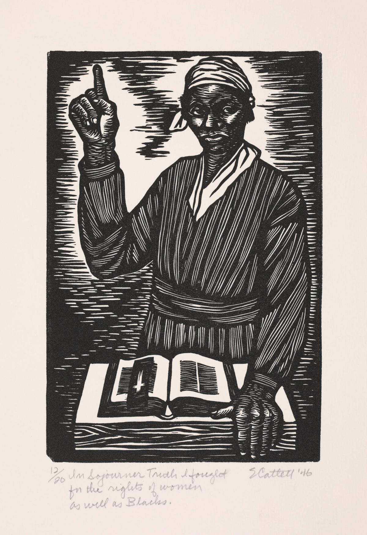 Not on viewElizabeth Catlett, an important Black artist, here depicts Sojourner Truth (ca. 1797–1883), the abolitionist and women’s rights activist. Born Isabella Baumtree, she gave herself the name Sojourner Truth upon becoming convinced that God had called her to go forth into the countryside to speak her truth to others. Born into slavery in New York state, she escaped to freedom in 1826. Two years later, she was one of the first Black women to go to court against a white man and win; Truth successfully sued to get her son back after he was sold to a man in Alabama by one of the men who had enslaved her. Truth dedicated her life to speaking out for a more equal society for Blacks and for women.