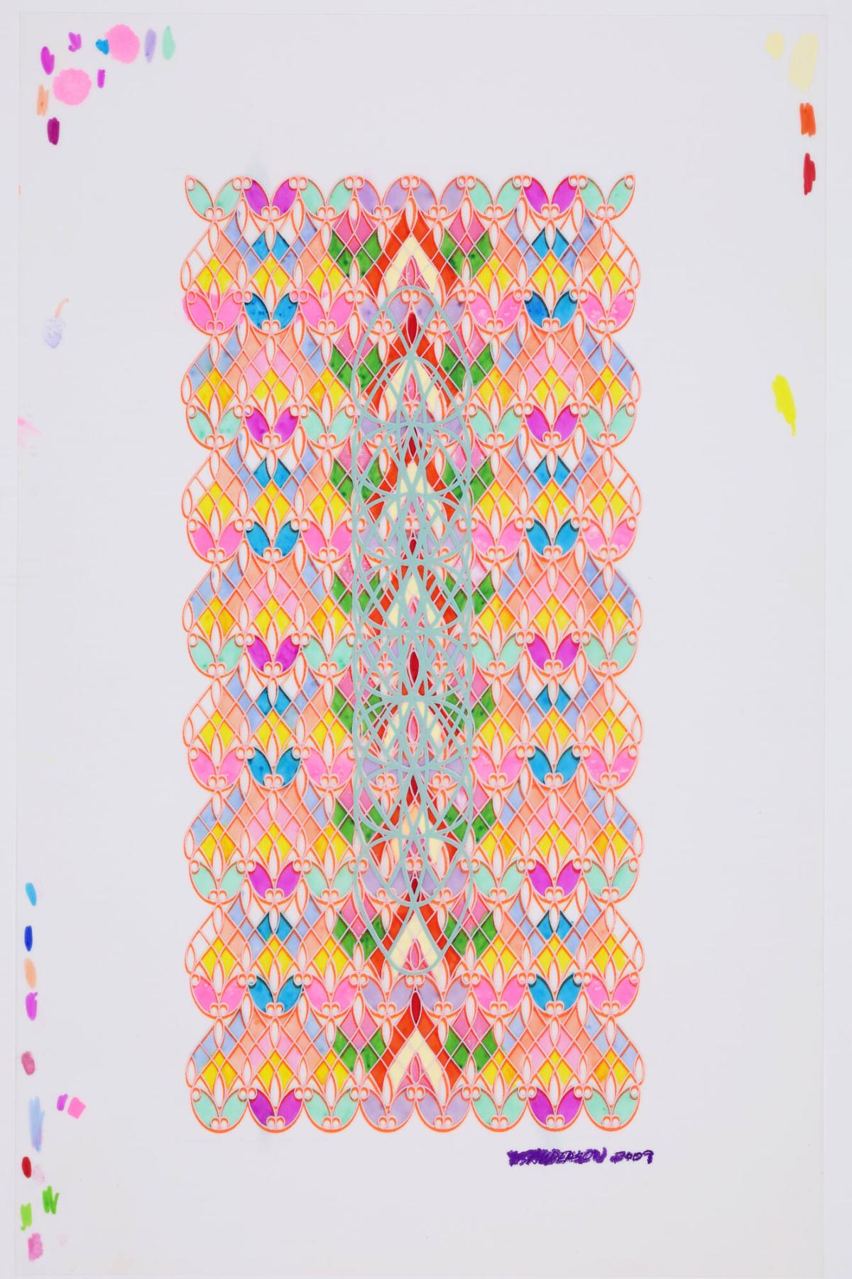 Not on viewPattern, repetition, brilliant color, motifs derived from Asian textiles and medieval manuscript illumination, and the flowing intricacy of stained glass all characterize the work of Cleveland-area artist Douglas Sanderson. The central pattern of this print is meant to evoke the human spine, with a reference as well to the chakras, the cycle of subtle psychic energy that is part of Eastern systems of belief. “All of my experiments with process and imagery,” the artist has written, “are finally finding clarity as a byzantine kind of mystery.”