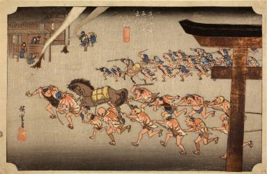 Not on viewAt Miya Station, a town that grew by the Shintō shrine Atsuta Jingū, a ritual occurred on the fifth day of the fifth month of the lunar calendar. Called Tango no Uma no Tō, the day featured the running of horses. This print depicts two teams rushing past the torii gate of the shrine. The scene of the horses pulling forward amid the vigorous shouts of the men is filled with lively movement and energy.