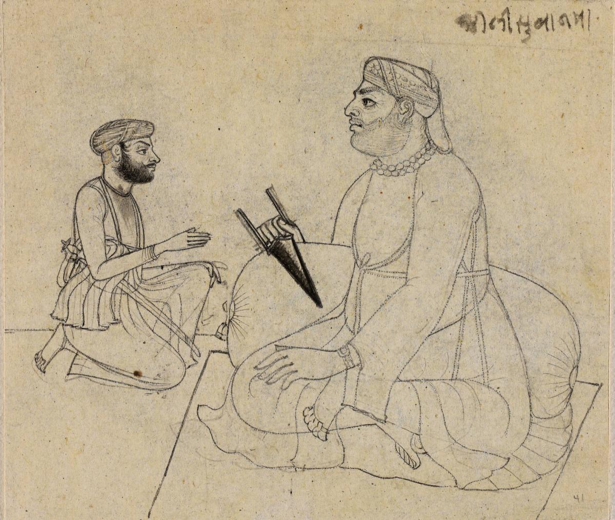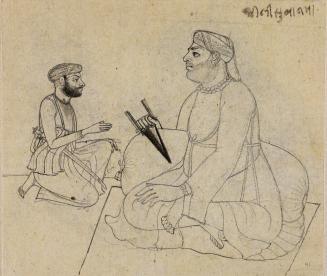 On viewPortraiture was an important genre of Rajput painting, recording the idealized appearances of the rulers and aristocrats of the Rajput court. Sometimes, people who were not nobility but served the rulers in some way were also captured in portraits. Here, we see a large man seated and resting against a cushion. He holds a katar, or punch-dagger, at the ready; was he a respected soldier or bodyguard for a Rajput ruler?
