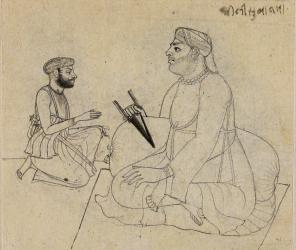 ProvenanceR. E. Lewis, San Fransicso; acquired 1964 by Parks [1930-2011] and Christie [1931-2019] Campbell, Fort Worth, TX; by bequest 2020 to Allen Memorial Art Museum, Oberlin, OHThis preliminary drawing for a painting shows how Rajput court painters would work out compositions on paper of a lesser quality before working on the final painting. Here you can see the lines of the initial sketch, and then the darker lines of the more finished composition. If you look very closely, you can see tiny pin-prick holes all along those final lines. This is a technique called “pouncing,” used to transfer a drawing. A painter lays the drawing on the final surface and then pats a small bag filled with coal dust on the drawing, forcing the dust through the small holes and leaving an outline of the composition on the new surface, to be finished with lines and colors.