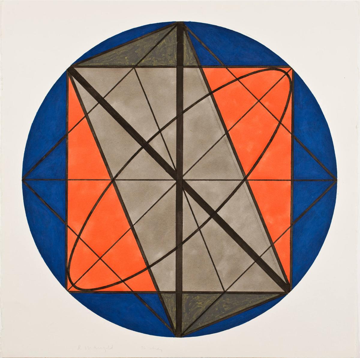 Since the mid-1960s, Robert Mangold has created works that display a rigorous use of geometric forms and broad swaths of colored, abstract shapes. In 1990, at the suggestion of Oberlin College professor of art John Pearson, Mangold began to create designs for a stained glass window for the College's Finney Chapel, completing the vision of architect Cass Gilbert-who also designed the AMAM-for one of the most prominent buildings on Oberlin's campus. Finney Chapel was finished in 1908, but the large round window facing Tappan Square had been left empty of decoration. Gilbert's intent was that its colors be "rich and impressive .!.!. deep blues and full reds and yellows," but a disagreement between the architect and the donor led to the project's postponement.
