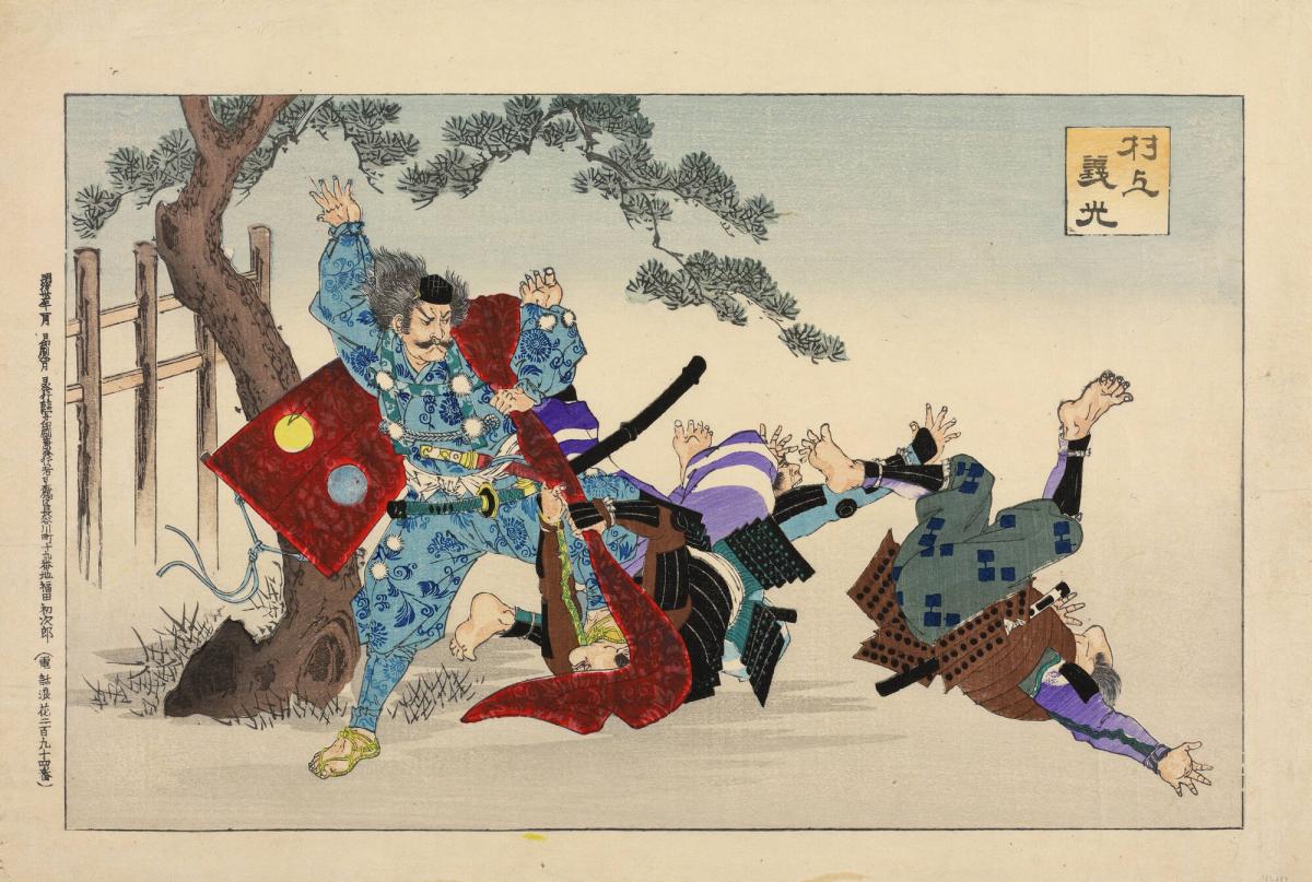 Murakami Yoshimitsu Repelling Three Attackers, from an untitled series of historical subjects