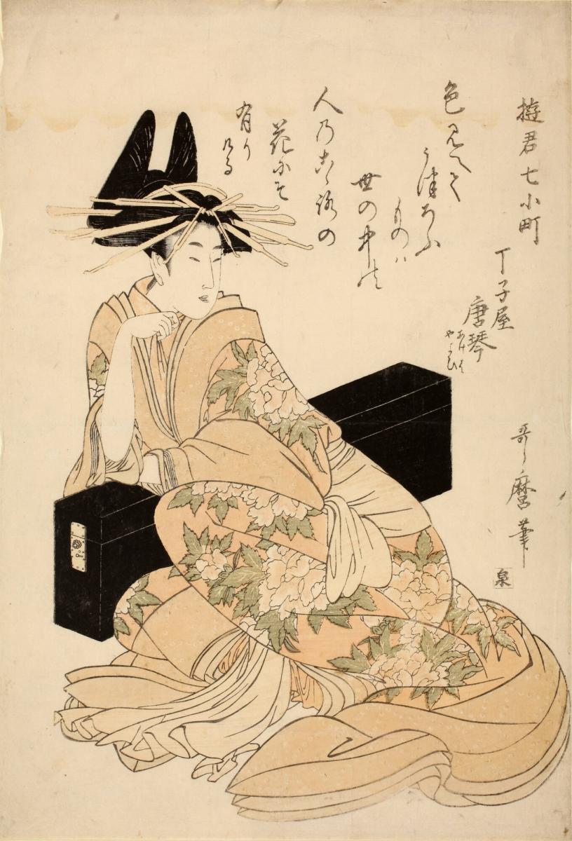 The Courtesan Karagoto of the Chojiya House Leaning on an Instrument Case, from the series Courtesans Representing the Seven Aspects of the Life of the Poetess Ono no Komachi