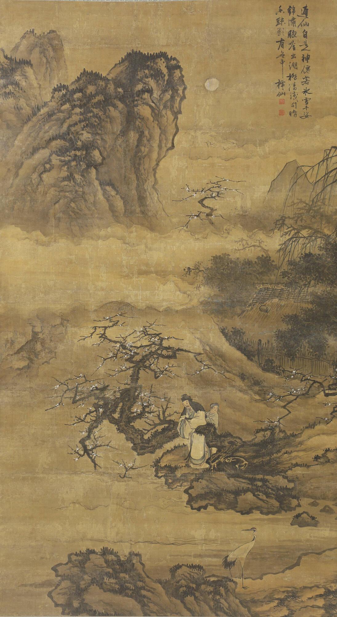 This painting by the Ming-dynasty artist Xie Shichen includes references to virtually all of Lin's key attributes. It depicts the poet, accompanied by a servant boy, leaning on a gnarled plum tree that has just come into bloom and gazing at a reflection of the moon in the waters of West Lake. A crane stands on the lakeshore in the foreground, while the roof of Lin's hermitage can be seen in the misty background. A poem in the upper right corner refers to Lin's efforts to become an immortal.