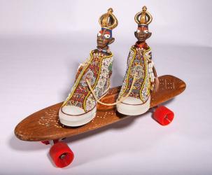 This sculpture is inspired by the artist’s recreation and reimagining of the sacred arts of the African diaspora. Here, a vintage skateboard is topped by two carved ibeji figures, devotional sculptures of Yoruba (Nigerian) origin meant to represent deceased twins. The interlace design on the tongue of each sneaker represents Yoruba concepts of interconnectedness and circularity; the raffia cord links the richly beaded shoes just as the work itself ties together Afro-Atlantic spiritual traditions and references to contemporary Black culture.
