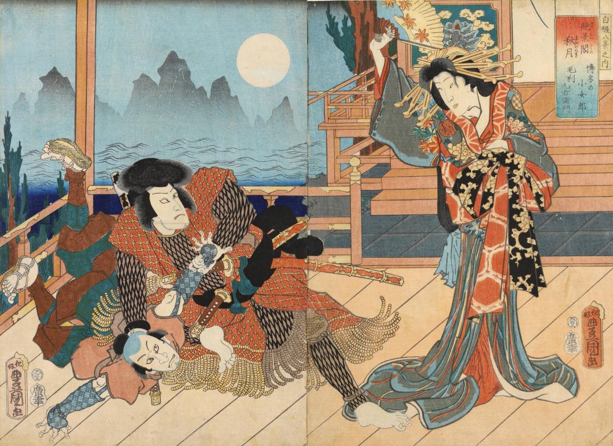 The characters Hakata no Kojorō (R) and Kezori Kuemon (L) in the play Hakata no Kojorō Namimakura from the series Eight views of Shiranui