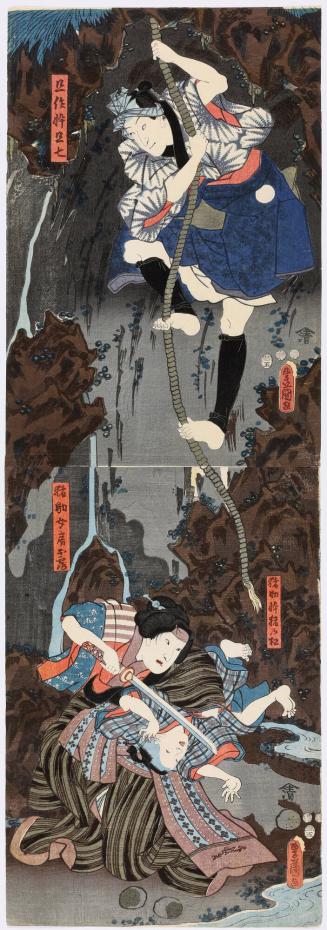 Tadasaku‘s Son (Segare) Tadashichi (top), Inosuke's Wife (Nyōbō) Otsuyu and Inosuke's Son (Segare) Inomatsu, from the play Shiranui Monogatari