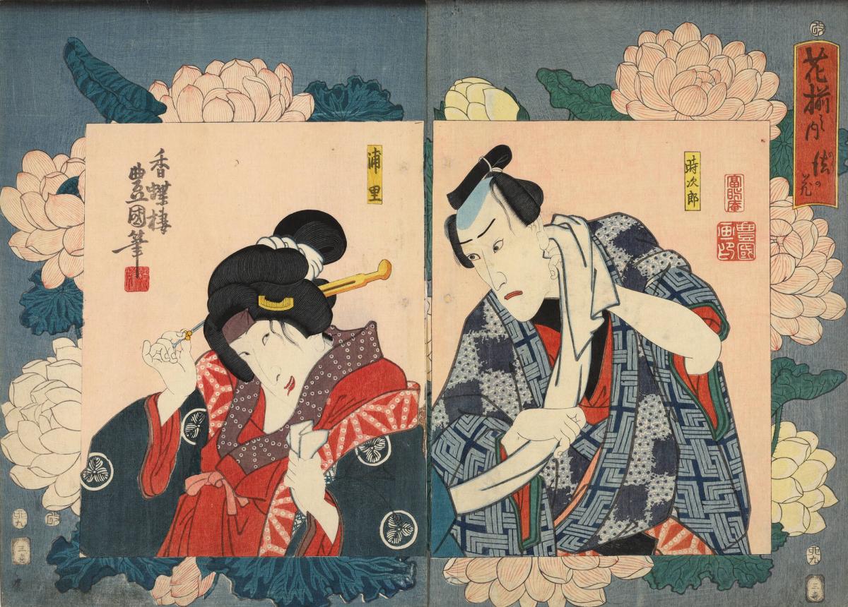 Lotus Blossom: Bando Shuka as Urasato and Ichikawa Danjuro VIII as Tokijiro, from the series Flower Collection (Hana Soroi no uchi)