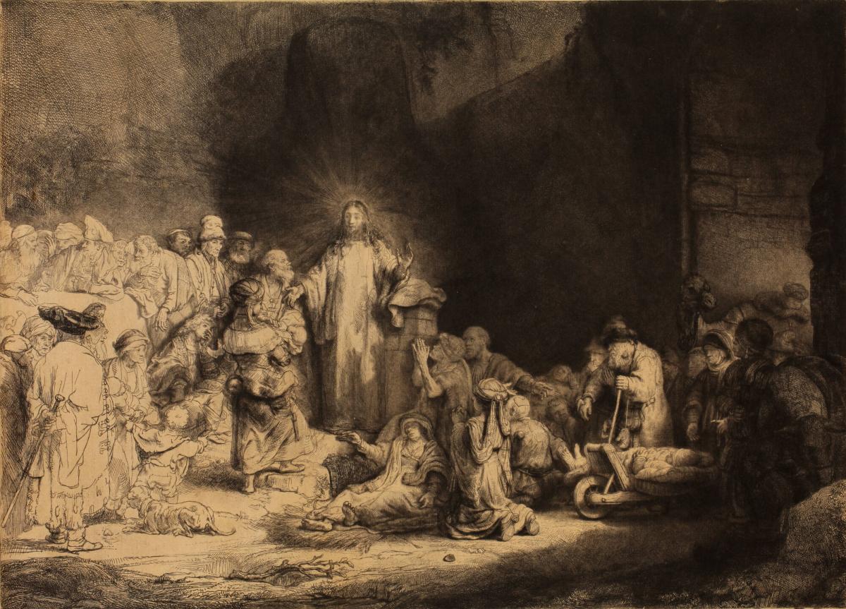 Rembrandt depicts Christ purifying souls and healing the sick by incorporating different scenes from chapter 19 of the Gospel of St. Matthew. The chiaroscuro effects divide the print into two sides of light and dark, adding depth and enhancing the position of Christ as a beacon of light. Rembrandt’s usage of shading draws visual attention to Christ’s powers as a physical and spiritual healer and challenges common conceptions of good and evil as they relate to light and darkness. The varying appearances and unembellished outlines show that each person has their own reason to see Christ. Here in the darkness is where true faith lies.