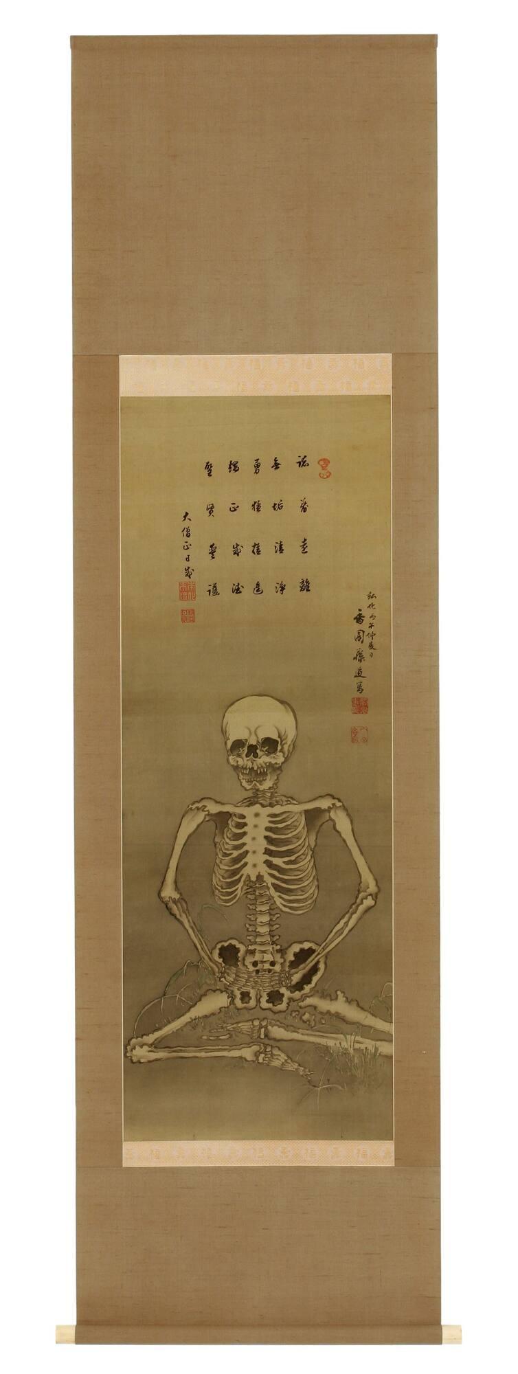 Not on viewThis arresting painting of a skeleton seated in a posture of meditation is a powerful reminder of the imminence of death but might also suggest the potential for transcending the physical body through Buddhist practice. This work may relate to an earlier Japanese Buddhist artistic subject, the “Nine stages of a decaying corpse” (Kusōzu 九相図). In nine images this series shows the physical decay of a human body and is intended to encourage reflection on impermanence. The eighth image is of a complete skeleton, and the ninth shows that skeleton disjointed and broken apart. The meditating skeleton subject may be a creative addition to that familiar series, which was widely known by the Edo period (1615–1868) through woodblock prints as well as paintings presented to the public at Buddhist temples. An earlier version of the meditating skeleton subject exists, painted in 1787 by the prominent painter Maruyama Ōkyo 円山応挙 (1733–1795) and in the collection of Daijōji Temple in Hyōgo, Japan.
