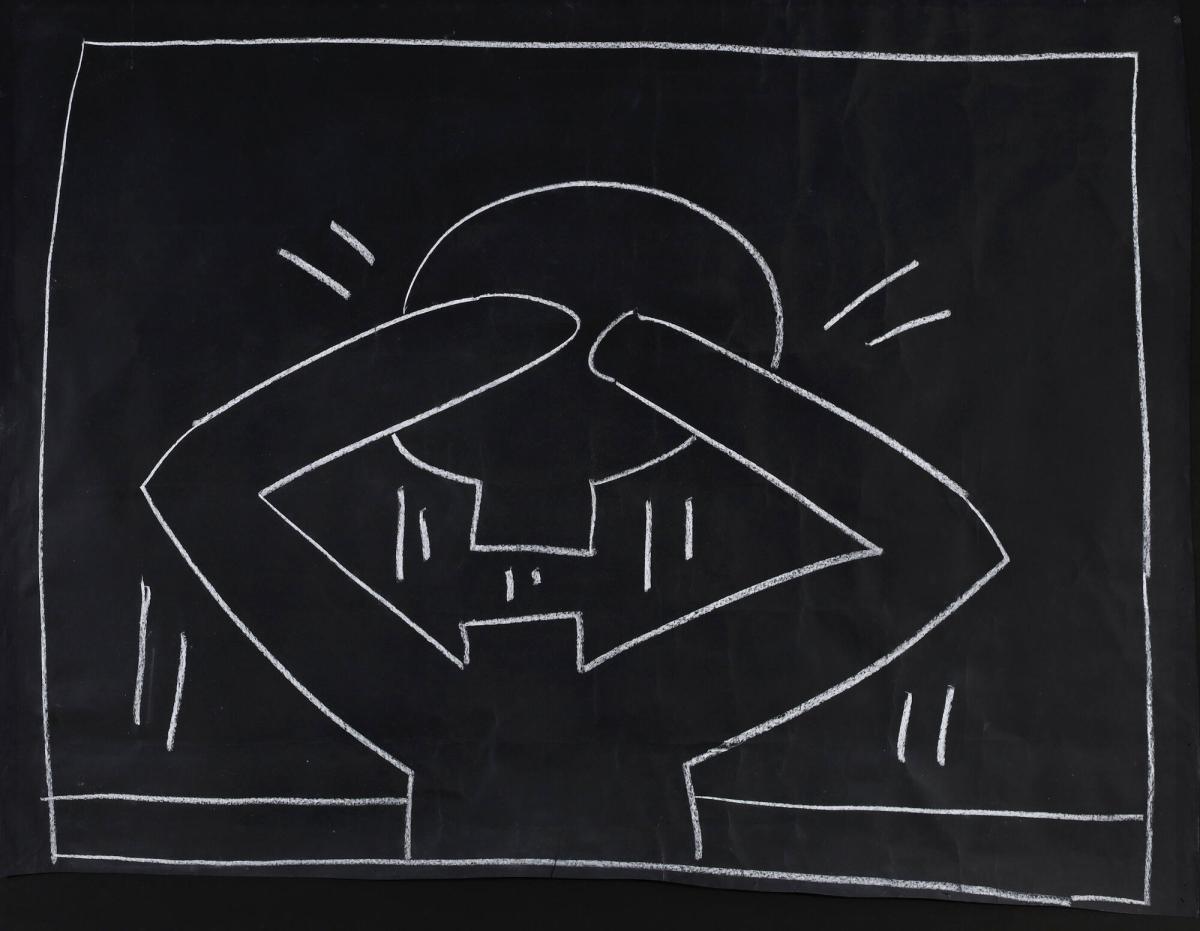 Not on viewBetween 1980 and 1985 Haring created thousands of drawings in New York City subway stations on the black paper within vacant advertisement frames—inserting art into spaces reserved for commercial messaging. This chalk drawing comes not from an actual subway station but from a demonstration Haring gave based on these works for a class at Parsons School of Design.