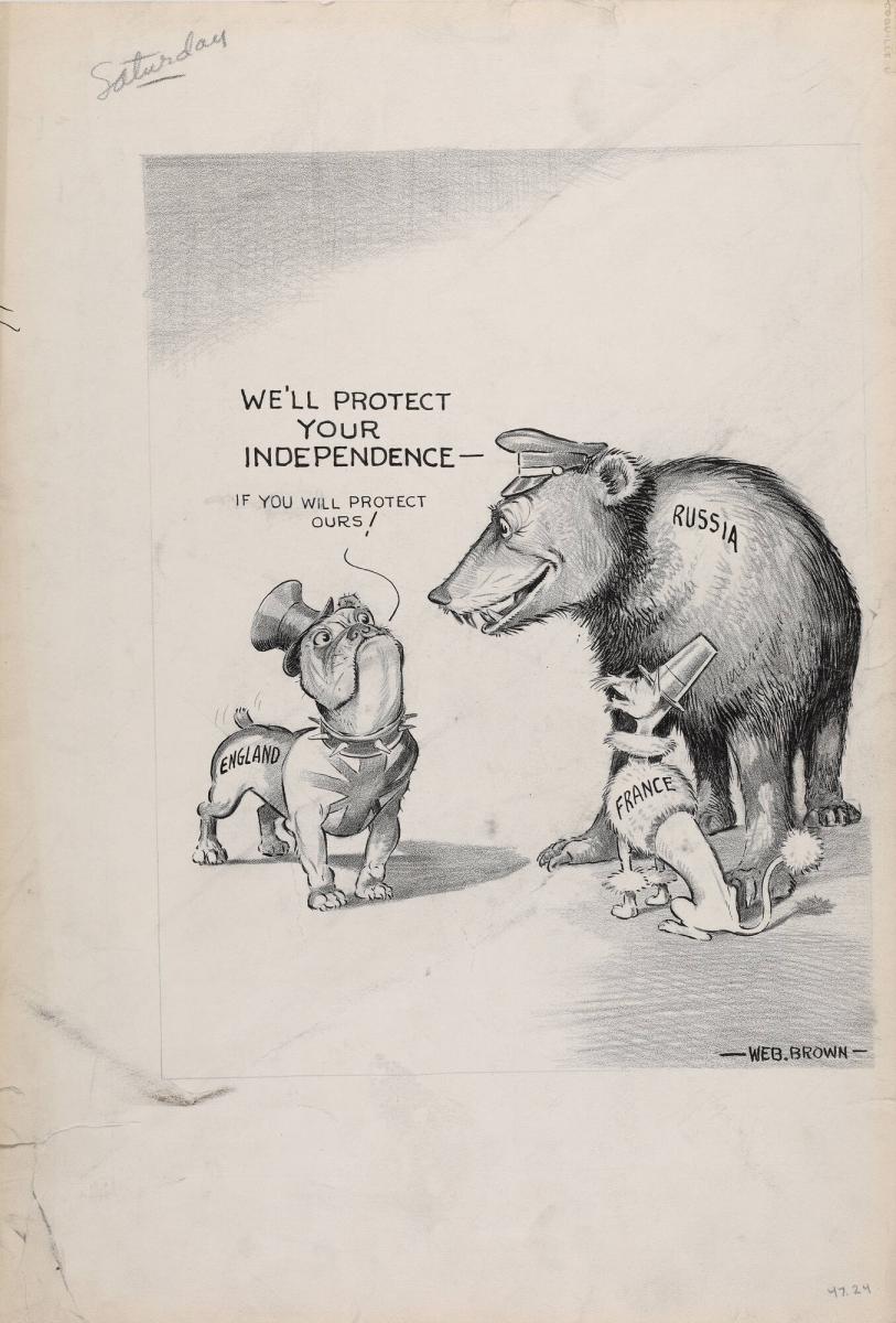 English Bull, Russian Bear, and French Poodle, drawing for an Akron Beacon Journal cartoon