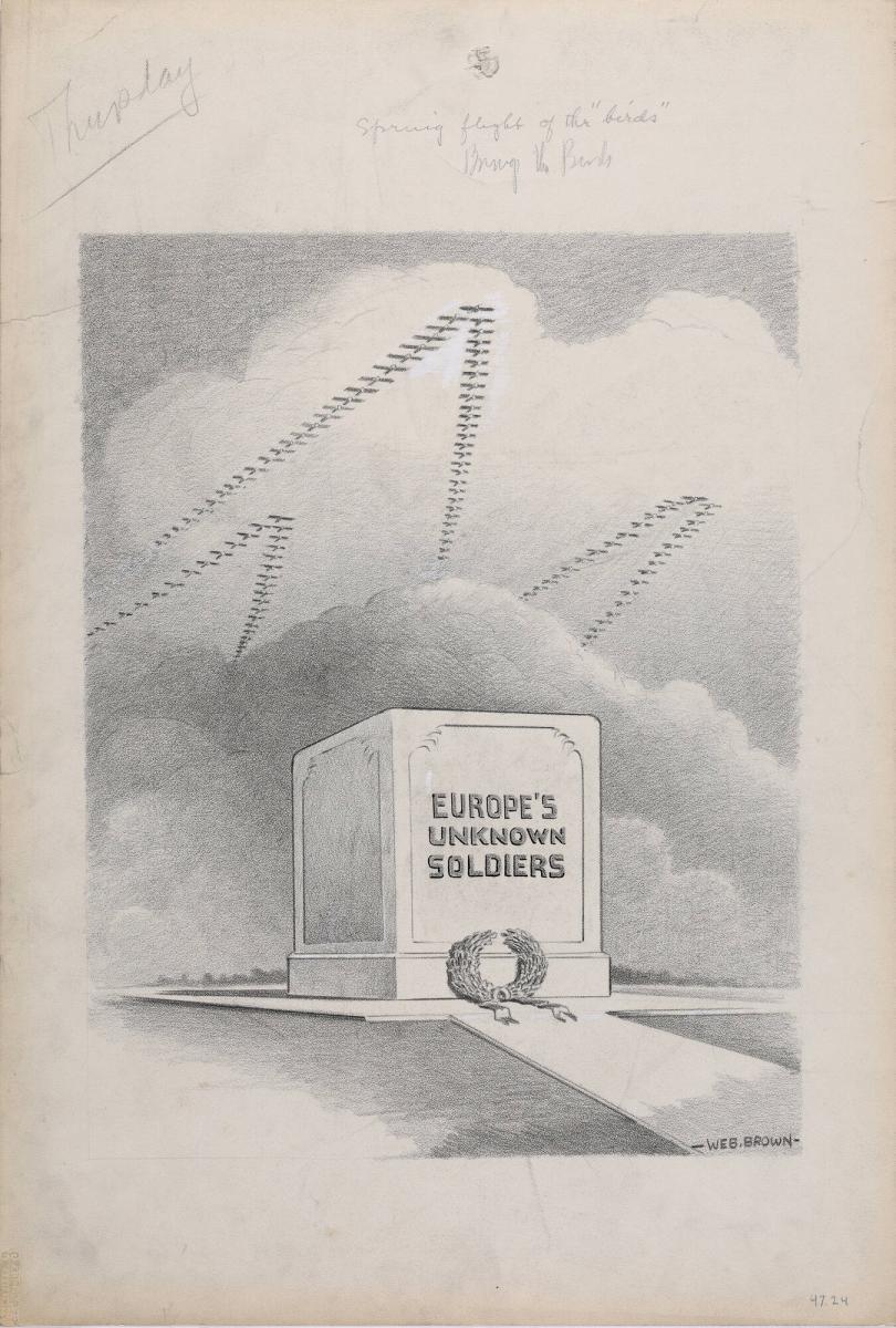 Spring Flight of the "Birds" Brings the Bombs, drawing for an Akron Beacon Journal cartoon