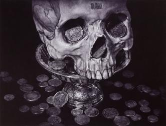 What is the price of life? Wal Chirachaisakul’s riveting image uses a symbol of death to ask the viewer to reflect on life. A human skull rests in an ornate offering tray used in Thai Buddhist temples, surrounded by coins. The artist has said that the work is in part a critique of materialism, which he argues is a false measurement of success and happiness.