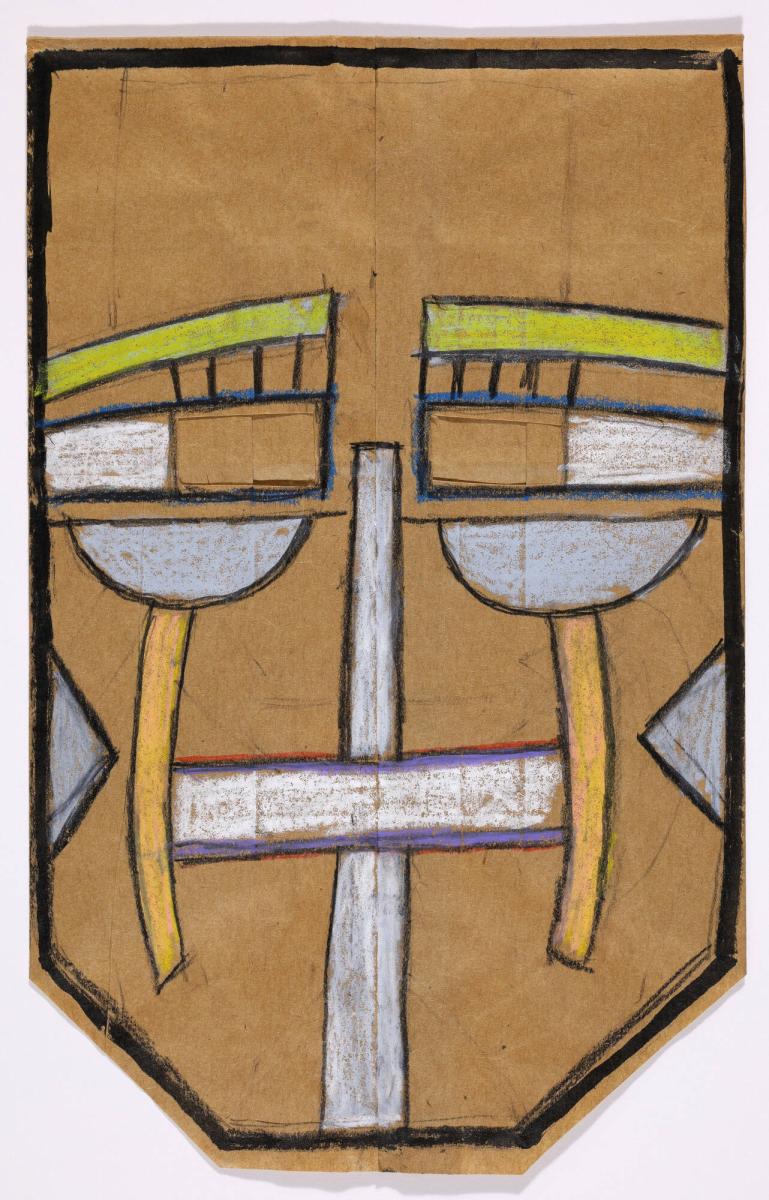 MediumCrayon, marker, colored pencil, and pastel on cut brown paper bag