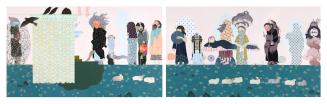 Not on viewA line of figures waits patiently in a field of flowers and sheep, moving toward a large curtain. Blue-gloved hands emerge from it to check temperatures and deliver a vaccination. Any viewer who experienced the COVID-19 global pandemic can probably identify with the figures’ face masks, weary expressions, and sense of isolation and resigned waiting. The complex emotions surrounding the vaccines are subtly conveyed by the figures: the backward glance of the woman leading her child to the curtain, the disembodied hands delivering the vaccine, and the ambiguous status of the character on the far left, entwined in a floral fog.
