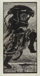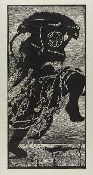 Kentridge addresses Apartheid in South Africa through performance, installation, and stop-motion animation. This linocut, printed from a panel of incised linoleum flooring, features a woman morphing into a rotary phone. Reflecting on the way new technologies alter our relationships to the past and to one another, Kentridge commented, “An old mechanical telephone exchange, for me, is an easy way of drawing the points of exchange and of communication that we are all locked into now.”
